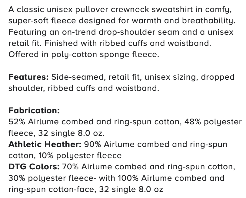 It's a classic unisex Bella Canvas pullover crewneck in SUPER COMFY, SUPER SOFT fleece designed for warmth and breathability. Drop-shoulder seam and a unisex fit. Finished with ribbed cuffs and waistband.