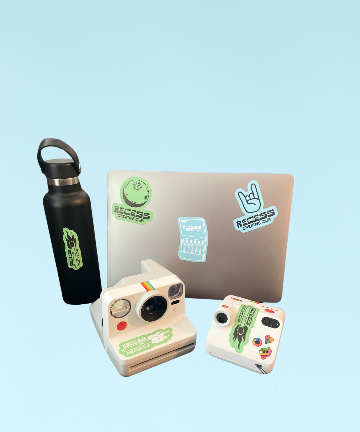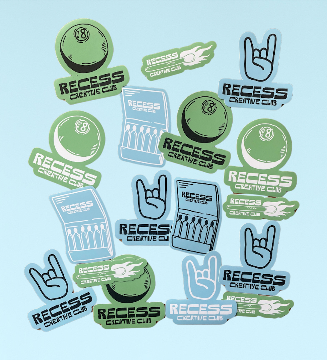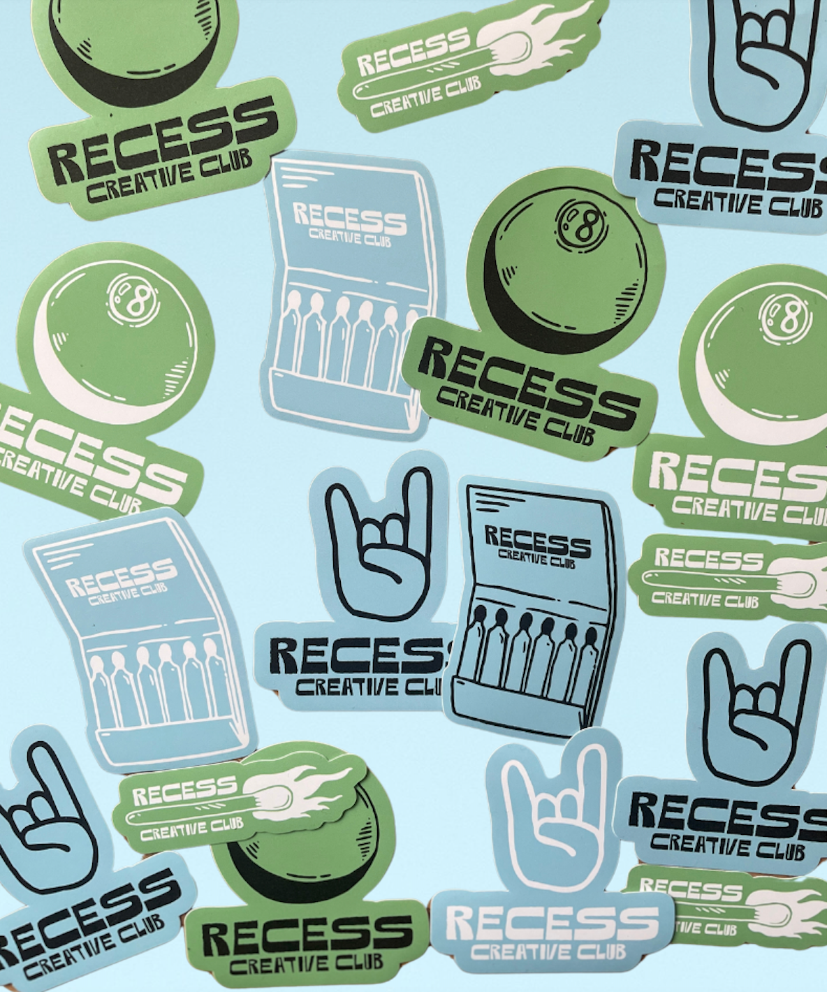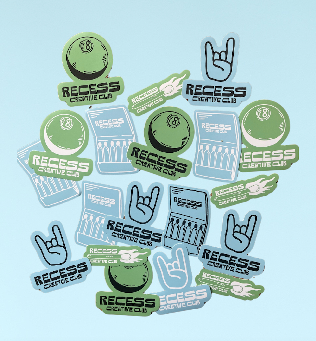 A Recess-sticker 4 pack! A random selection of 4 Recess stickers (one of each type: disco ball, match, matchbook + hand). Mixture of black and white ink-- the exact 4 you get is a lottery!